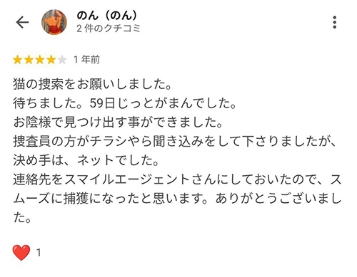 ペット捜索のご依頼をいただいたお客様から、たくさんのお喜びの声をいただきましたので一部ご紹介いたします。