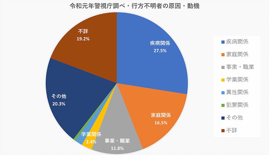 令和元年の警視庁の行方不明者データによると、失踪者の原因や動機は以下の通りとなっています。